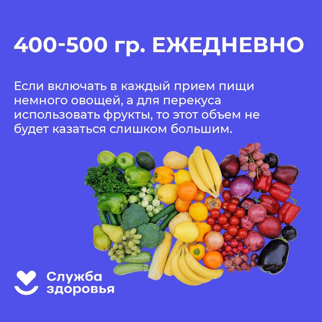 В ежедневный рацион необходимо включать не менее 400-500 граммов овощей и фруктов (5 порций). Сюда входят свежие, свежезамороженные и приготовленные овощи и фрукты, листовая зелень, а также сухофрукты. Оптимальное соотношение: 3 порции овощей, за исключением картофеля, и 2 порции фруктов. Более высокий уровень потребления овощей и фруктов не несет дополнительной пользы.