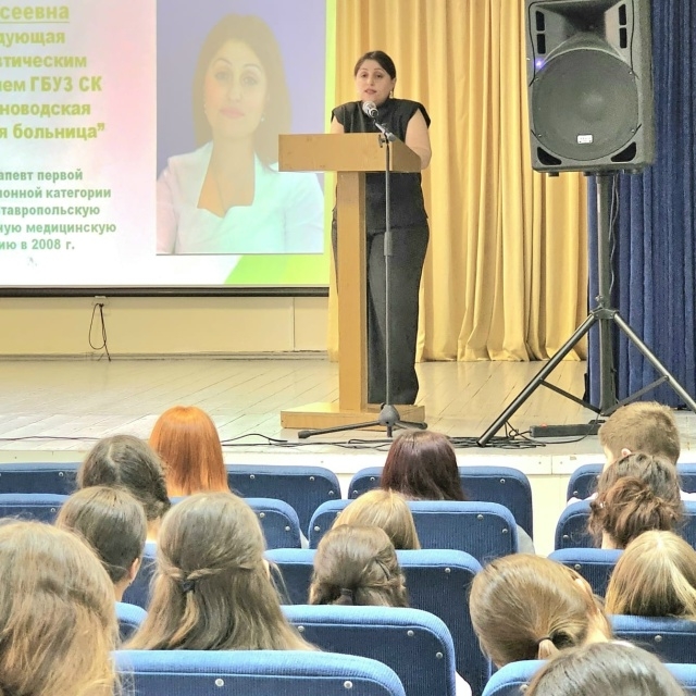 Заведующая терапевтическим отделением стационара Марианна Одиссеевна Шахбазова побывала в школе номер 10 г.Железноводска, где рассказала ученикам об особенностях профессии врача - терапевта, возможностях обучения по целевому направлению, о перспективах работы в Железноводской городской больницы.